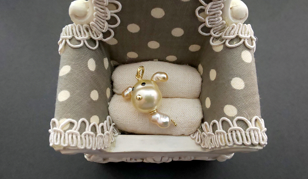 11mmの大粒白蝶真珠と南洋ケシ真珠をワンちゃんに見立て、ブラックダイヤモンドのお目目、鼻、首輪やシッポは18Kです。